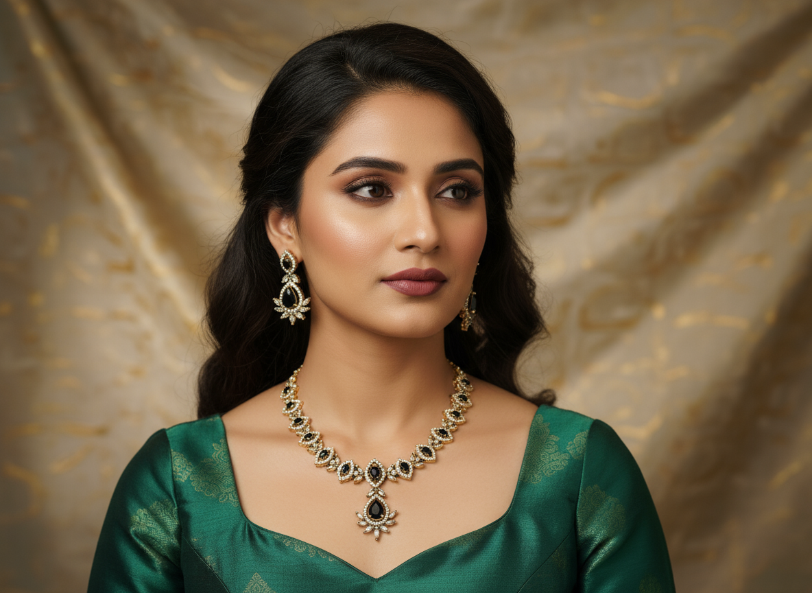 Grace your look with this AD sleek jewellery set, beautifully finished with an antique polish and adorned with Black diamond-lookalike stones. Paired with elegant matching earrings, this set strikes the perfect balance of tradition and modern charm – ideal for weddings, festive occasions, or evening parties.
