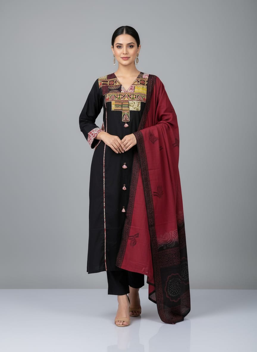 This black Ajrakh printed kurta features exquisite detailing on the neckline and pockets, crafted from pure cotton for breathability and comfort. The accompanying double shade dupatta adds a subtle contrast, enhancing the traditional handblock print with a contemporary flair. Perfect for casual outings and ethnic occasions alike, this ensemble blends artisanal craftsmanship with modern style.